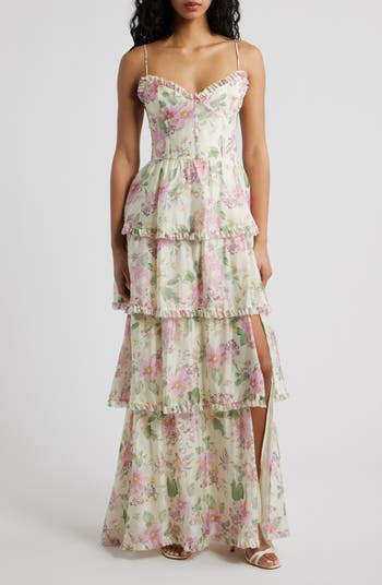 Dainty ruffles enhance the romantic charm of this floral maxi dress fashioned with a corset-inspired bodice above a fluttery tiered skirt.