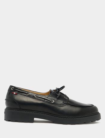This Gusto derby in black buffalo leather features a boat shoe upper and a modern chunky sole. The lateral collar is finished with a small Bally Ribbon tab.