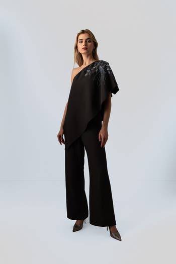 The asymmetrical draped neckline creates an unique silhouette, while the subtle yet striking sequin embellishments on the shoulder enhance the sleeve. The wide-leg fit ensures comfort while maintaining an effortlessly chic vibe, perfect for special occasions or evening events. The Gwen jumpsuit blends minimalist structure with eye-catching details, making it the ideal choice for those looking to stand out without compromising on sophistication.