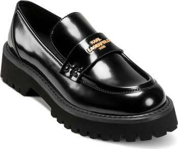 Minimalist logo hardware glints against the ultraglossy faux leather of a luxe loafer set on a sturdy lug sole.