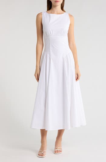 A set-in waist adds throwback glamour to a sweet and simple dress cut from stretch-kissed, cool cotton.