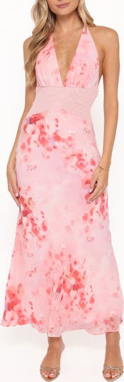 Blooming with pink florals, this halter maxi turns heads with a plunging V-neckline and a floaty A-line skirt. The silhouette skims the figure and moves beautifully, while a smooth lining and invisible side zip keep the finish sleek for garden parties and RSVP‑yes plans.