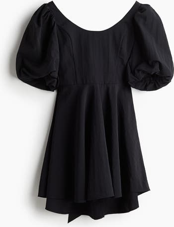 Short, fitted dress in woven fabric with a scoop neckline and a deep back with wide ribbons that tie in a bow. Short, organza-filled balloon sleeves with elasticated cuffs, and a circular skirt. Concealed zip at one side. Partly lined.