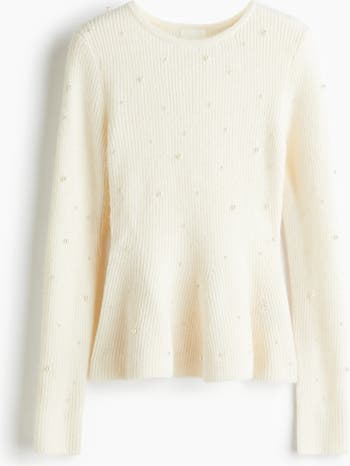 Fitted top in a soft rib knit containing some wool, embellished with beads. Round neckline, long sleeves and a flared peplum.