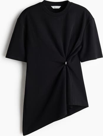 Top in heavy interlock cotton jersey with a round neckline, dropped shoulders and short sleeves. Asymmetric hem and a metal detail at one side of the waist that cinches the fabric to create a draped effect.