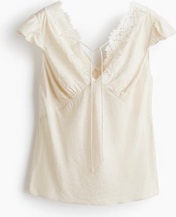 Top in a jacquard weave made from a viscose blend. Features a deep, lace-trimmed V-neckline at the front and back with spaghetti ties at the front. Flutter sleeves and angled seams below the bust with gathers.