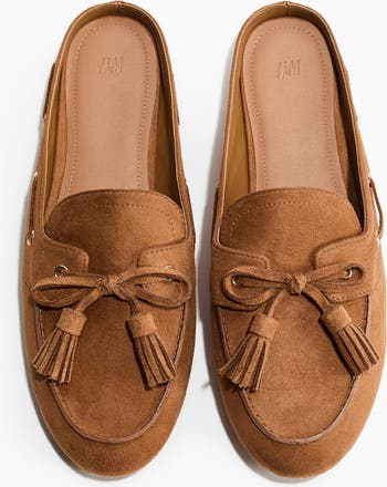 Loafer mules with a soft, napped finish featuring almond toes, a moccasin seam at the front and lacing around the top. Twill linings.