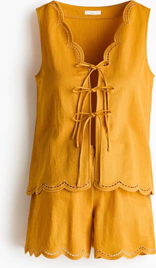 Set with a top and pair of shorts in woven fabric featuring scalloped trims with broderie anglaise. Sleeveless top with a deep V-neckline, an open front with three sets of narrow ties and darts at the back. Shorts with covered elastication and a small frill trim at the waist.