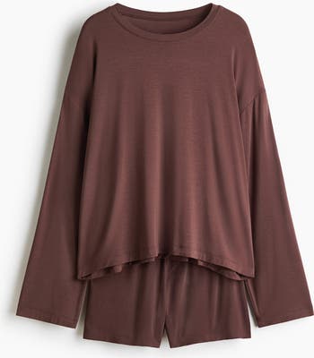 Pyjamas with a top and pair of shorts in soft modal jersey. Top with a round neckline, dropped shoulders and long sleeves. Shorts with an elasticated waist and a fake fly.