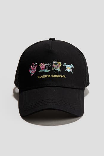 Trucker cap in cotton twill and mesh with a motif on the front. Covered button on top and an adjustable plastic fastener at the back. Cotton sweatband.