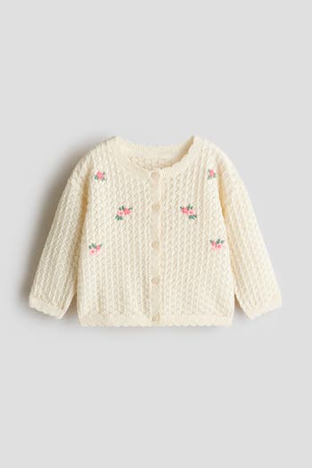 Cardigan in soft pointelle-knit cotton with scalloped edges. Round neckline, dropped shoulders and long sleeves.