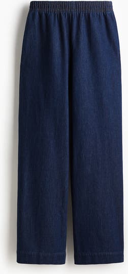 Loose-fit trousers in cotton denim with elasticated smocking at the waist. Discreet side pockets, decorative welt pockets at the back and wide legs.