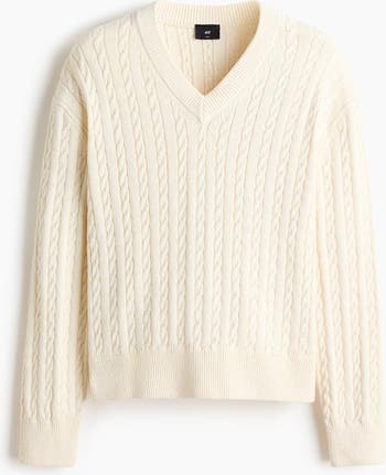 Jumper in cable-knit cotton featuring a ribbed V-neck, long sleeves and a ribbed trim at the cuffs and hem. Regular fit for comfortable wear and a classic silhouette.