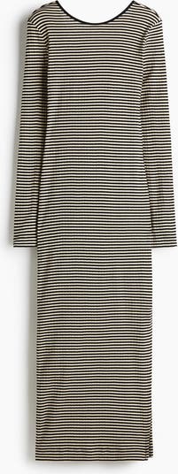 Ankle-length, fitted dress in ribbed cotton jersey with a round neckline, scoop back and long sleeves. Straight-cut hem with a slit at one side.