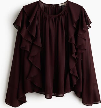 Oversized blouse in a sheer weave featuring a round neckline with gathers at the front and back, and an opening with a button at the back. Long sleeves and double flounce trims at the front that continue over the shoulders to the back.
