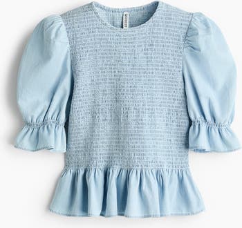 Smocked blouse in soft cotton denim with a round neckline and short puff sleeves with narrow elastication and flared cuffs. Gathered seam at the waist and a flared peplum.