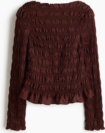 Short, fitted top in a smocked, viscose-blend weave with frill trims. Features a boat neckline and long sleeves.