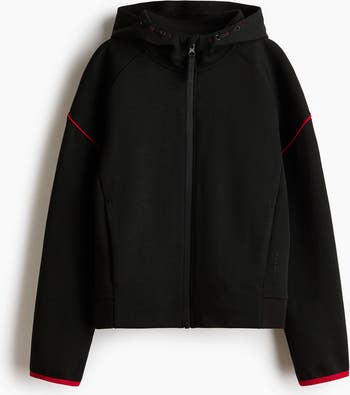 Sports hoodie in functional scuba fabric made with DryMove™, which helps pull moisture away from your skin, keeping you comfortably dry while moving. Regular fit with a stand collar, hood, a zip down the front, long raglan sleeves, and side pockets with a concealed zip. Narrow elastication at the cuffs and a wide, ribbed trim at the hem.