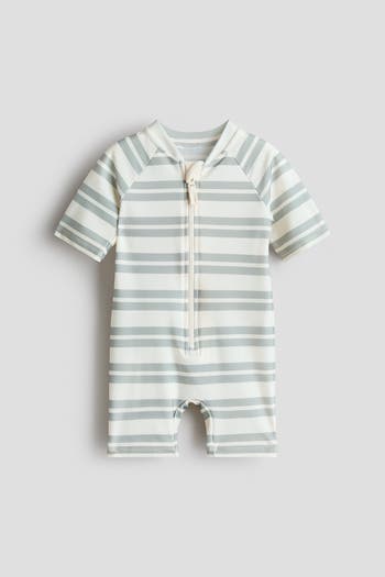 Swimsuit in UV-protective material with a stand-up collar, a zip at the back, short sleeves and a frill trim over the shoulders. Lined front. UPF 50.