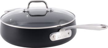 - Hard-anodized aluminum/stainless steel with nonstick coating and glass lid