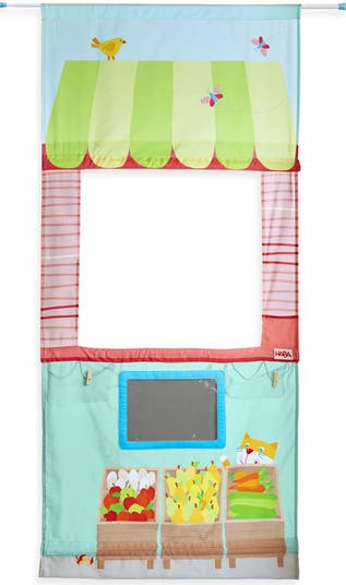 - SIMPLE SET UP FOR HOURS OF PLAY: Set up shop in seconds by simply extending and setting the included telescopic bar into a door frame and kids will be ready for business. Easy to move to any door in the house. Pole has capped ends to prevent damaging door frames. The included beech wood slats keep the store hanging straight and secure. When it's closing time, kids can easily roll the market up and store until the next shopping day.