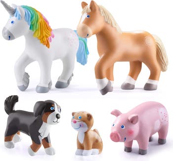 - ANIMAL FIGURINES SET: Includes 5 charming animals: unicorn, horse, dog, pig, and cat, to inspire magical, farmyard, and small animal toys play scenarios.H orse measures 4.5" long x 4" tall.