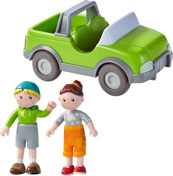With the HABA play set, two Little Friends are energetically out and about. The two adventurers Kati and Chris love trips with their green SUV . With a momentum motor , the sporty toy car for children from 3 years can also drive alone. The trunk can be opened easily and offers space for luggage, sports equipment and animal companions. The Little Friends car with trailer hitch perfectly complements the play world of HABA's flexible dolls and looks great in front of the doll's house. The lifelike mini dolls encourage creative play adventures. Made of safe, smooth, and solid plastic, Little Friends stand up to years of rough and tumble play but have a flexibility and luxuriousness that is missing in other rigid plastic figures. Figures measure 4" tall.
