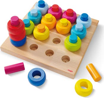 - COMPREHENSIVE 33-PIECE SET: These 2 year old toys include 16 pegs, 16 rings in 8 bright colors, and a pegging board measuring 7.5" x 7.5". A great addition to a stacking toys for toddlers collection.