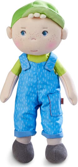 - His blonde hair, blue eyes and freckles help make him adorable. Til's face is embroidered and his blue overalls are removable with hook and loop fastener. Hat and shoes are sewn on.