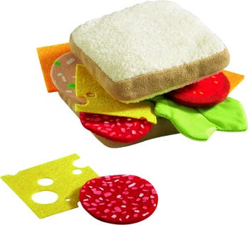 Unleash your child's culinary creativity with the HABA Kids Kitchen Pretend Play Food Set! This vibrant play food set features a variety of sandwich toppings, perfect for pretend play in any toy kitchen. With 2 soft, machine washable bread slices, 4 lunch meat slices, 4 cheese slices, a fresh tomato slice, and crinkly lettuce, kids can craft their own sandwich masterpieces in their kids kitchen accessories collection. Encourage role-playing and creativity while helping children develop fine motor skills and social interaction. This pretend food set is a great addition to any play kitchen for toddlers and kids cooking set. Made from soft, durable materials, this play kitchen food set is rigorously tested for safety and built to last. Perfect for grocery store pretend play, kitchen playsets, and fun toddler pretend play adventures. A fantastic gift for young chefs, this realistic food toy brings endless fun to any toddler kitchen playset or toy kitchen accessories collection. Let the pretend cooking adventures begin!