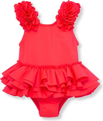 Tiers of ruffles fall down the length of this adorable one-piece swimsuit that will look oh-so-cute on baby.