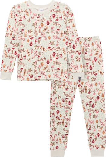 Cozy up your little girl for the season with this soft and stretchy 2-piece pajama set, perfect for festive winter nights. Made from exceptionally soft hacci fabric with gentle stretch, it offers a breathable and flexible fit for all-day or all-night comfort. The rounded collar and cinched cuffs at the wrists and ankles help keep everything in place while ensuring irritation-free wear. Finished in a warm off-white hue with red and green accents and a charming winter scene, this snug-fitting set brings cozy holiday cheer to bedtime routines.