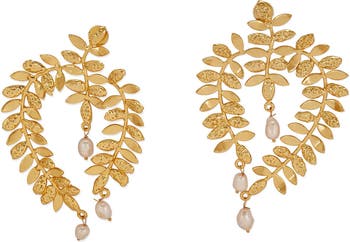 The Hadaira Pearl Earrings, handcrafted in brass and finished with 22k gold plating, are drop earrings that feature textured leaf motifs paired with baroque freshwater pearls. The sculpted silhouette creates gentle movement that catches the light with every step. Designed to transition seamlessly from daytime looks to evening occasions, this pair brings refined detail and standout appeal to both casual and dressy outfits, making it a thoughtful gift or a versatile addition to any jewelry collection.