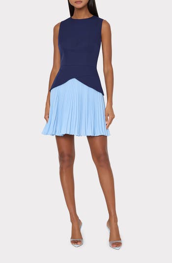 A fitted bodice with shapely darts and an extended V-cut hem meets a sharply pleated skirt on this colorblocked minidress designed to move from work to cocktail hour.
