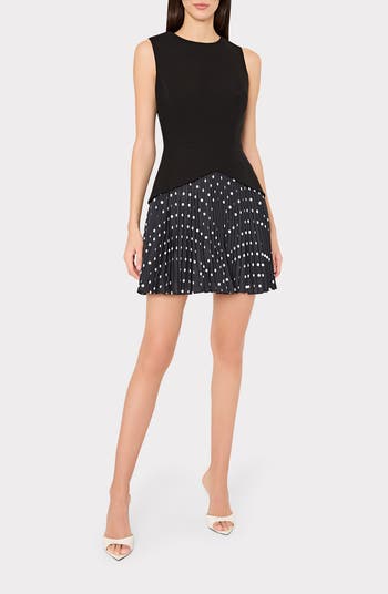 Allover dots cover the swingy pleated skirt on this sleeveless dress made with a close-fitting bodice and cut in a leggy length.