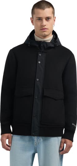 Men's Hader wool blend bomber jacket features a removable hooded bib with a zip closure. Designed with a snap front, large double-entry patch pockets, and rib knit cuffs and waistband for added warmth. Equipped with adjustable bungee cords on the hooded bib for a custom fit.