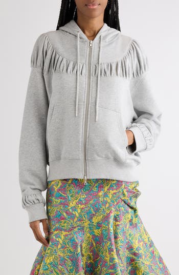 This cotton hoodie starts with clean sporty lines, then surprises with a gathered panel that orbits the upper body and cuffs like a soft current in motion. The texture adds a romantic lift without losing that throw-on-and-go ease.