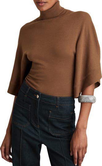 Fluttery, elbow-length sleeves frame this cozy all-wool sweater topped with a fold-over turtleneck that makes it a perfectly chic choice for cold-weather looks.