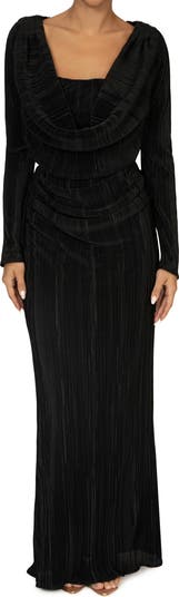 Petite pleats add visual allure to this party-ready set that includes a cropped top and a slinky, floor-sweeping skirt.