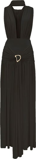 Long dress made of mesh and knit fabric, featuring a voluminous skirt with a fluid drape that provides movement and sophistication. The long stoles at the neckline allow it to be adjusted to preference, creating different silhouettes. It features an adjustable mesh draped strap at the hip and a luxury buckle that enhances the waist with a refined and feminine touch.