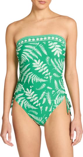 Cinched sides flatter your curves in this strapless one-piece complete with a tropical pattern and moderate back coverage.