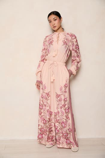 Elegant long jumpsuit in soft blush pink featuring a delicate floral print,a high neckline,long sleeves,a flattering waist tie for a feminine silhouette. The flowing maxi length adds grace and comfort, making it perfect for formal events, weddings,festive occasions,or evening wear.