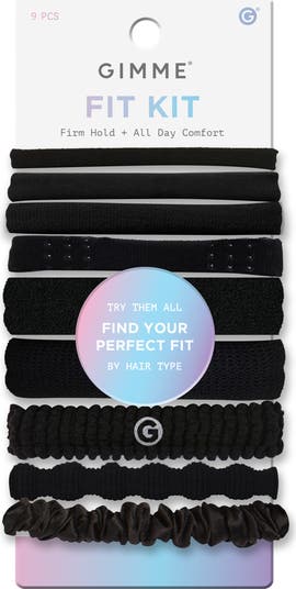 Transform your hair care routine with Gimme Beauty’s Bands Fitting Kit. This essential set includes five versatile black hair ties designed to cater to every hair type, from thick and curly to fine and straight hair. Our soft hair ties provide the perfect hair styling solution without compromising on comfort or style.The kit features a variety of sizes, including thick hair ties for voluminous styles, thin hair ties for delicate strands, and extra fine hair ties for those with very fine hair. Each elastic hair tie is designed to be snag-free and easy to remove, making them ideal for everyday use, workouts, or any active lifestyle. These women's hair ties add both functionality and elegance to any look.Whether you're creating a high ponytail, a sleek bun, or a simple hairdo, our elastic hair ties ensure a secure fit. Say goodbye to bad hair days with these gentle hair ties that ensure your hair stays in place all day long.At Gimme Beauty, we are a hair care brand with a mission to create a range of products that work for all hair types. Knowing hair solutions are not one size fits all. Each of you are unique, your hair care should be too. We celebrate your individual beauty and aim to elevate it with disruptive invention. Think of us as your go-to BFF for hair care. We'll give you the best advice, hype you up, and always make you feel comfortable in your own skin.We lean into the sisterhood created by our mutual experiences with hair. Where other beauty brands might value exclusivity or eliteness, we are all about inclusion and accessibility. Our goal is to amplify hair confidence, because we believe confident women are unstoppable.