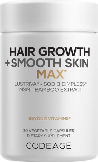 Codeage Hair Growth + Smooth Skin Max features clinically studied Lustriva® to support existing hair growth for a fuller look and help promote skin appearance.* It also includes clinically studied SOD B Dimpless® for healthy skin and cellulite support, plus 10,000 mcg biotin, vitamin C, hyaluronic acid, MSM, and liposomal delivery.*