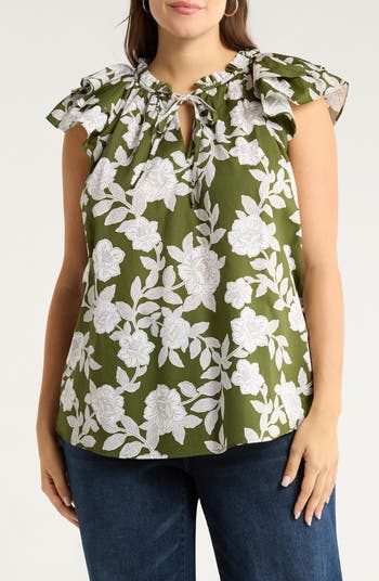 Elevate your casual look with the sophisticated style of this ruffled cap-sleeve shirt in a classic floral print.