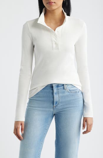 A half-button placket brings a modern look to this fitted, nicely draped turtleneck top made from breathable cotton.