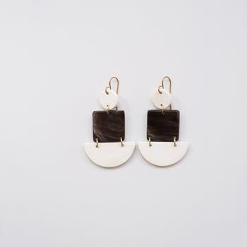Hand carved and polished cow horn earrings in a bold multi-geometric design. A small circle balances on top of a square and half circle shape that is sure to give a statement in the multitudes of horn color tones. Sustainably sourced horn from rural Ugandan cattle keepers, horn is used and upcycled instead of wasted Hand carved in small scale, Fair Trade artisan cooperative in Uganda High variability of horn color ensures that no two pieces are the same Jewelry pieces come in variable shades of white 14K gold plated findings and stainless steel posts crafted by Fair Trade verified program to provide employment and training to formerly trafficked women Skillfully assembled in Uganda with love and care HANDMADE IN UGANDA APPROXIMATE SIZE: 3" x 1. 5"