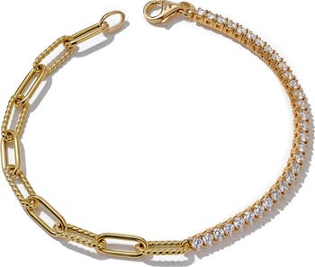 Find a beautiful mix of half shine and half sparkle on this eye-catching bracelet crafted with smooth and grooved paper-clip links partnered with a shimmering strand of four-pronged diamonds.