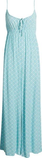 Warm-weather days are calling in this A-line maxi sundress covered in a tile-inspired print and designed with a keyhole-split bodice tied with slender laces.