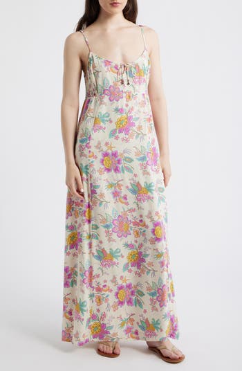 Swirling blooms sweeten the vibe of this light and airy maxi suspended by slender straps and finished with a flowy skirt.